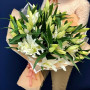 На фото букет из 9 лилий. В составе: лилия 9 шт, крафт-бумага 1 шт, атласная лента 1 шт, . Все цветы свежие и ароматные, букет красиво оформлен и отлично подходит для подарка. Доступна доставка цветов или самовывоз.